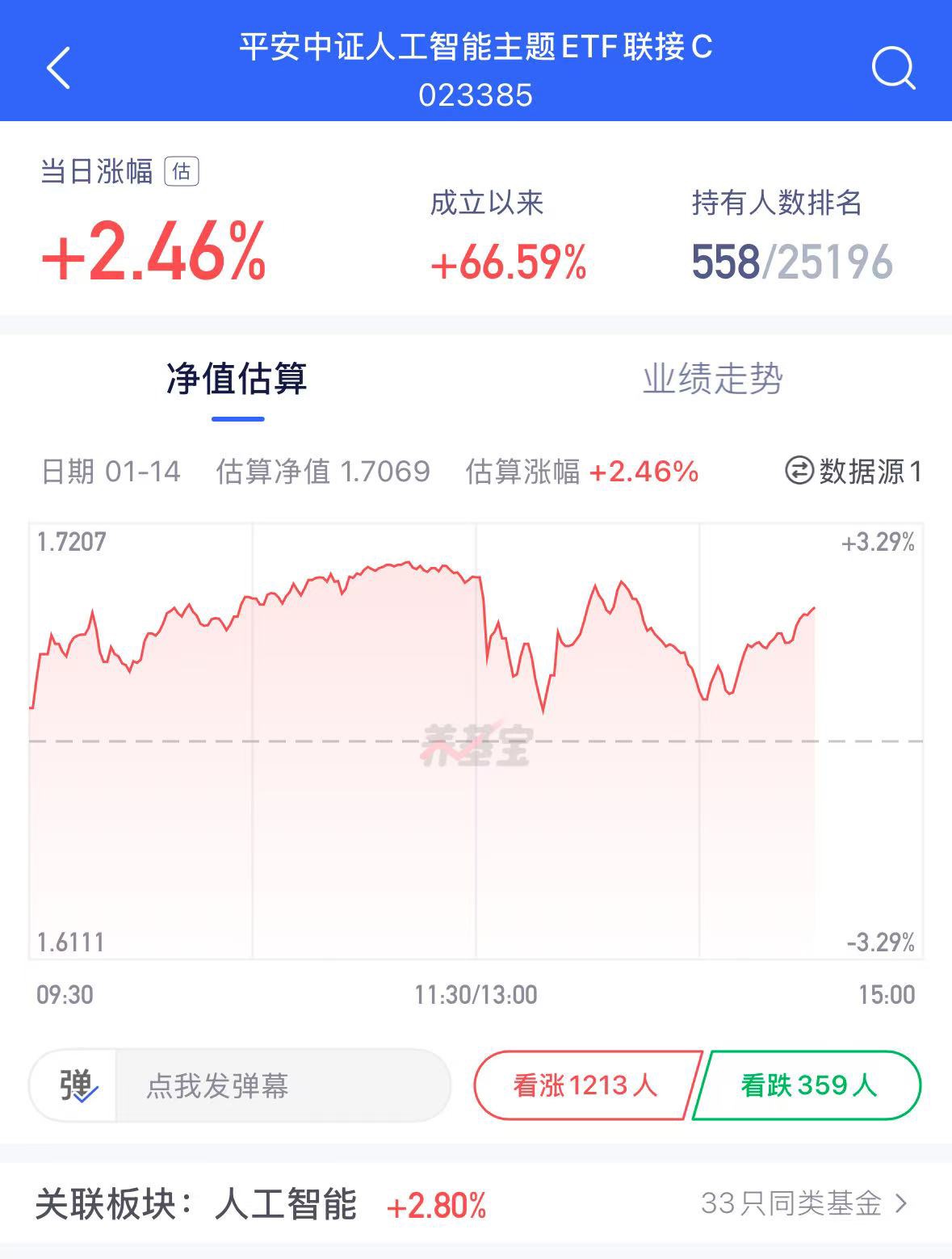 午后三大指数有点分化,不过人工智能还是持续强势,$平安中证人工智能主题ETF联接C$当前估值上涨2.46%不错哟,开年8个交易日涨7天不错不错,我持续看好