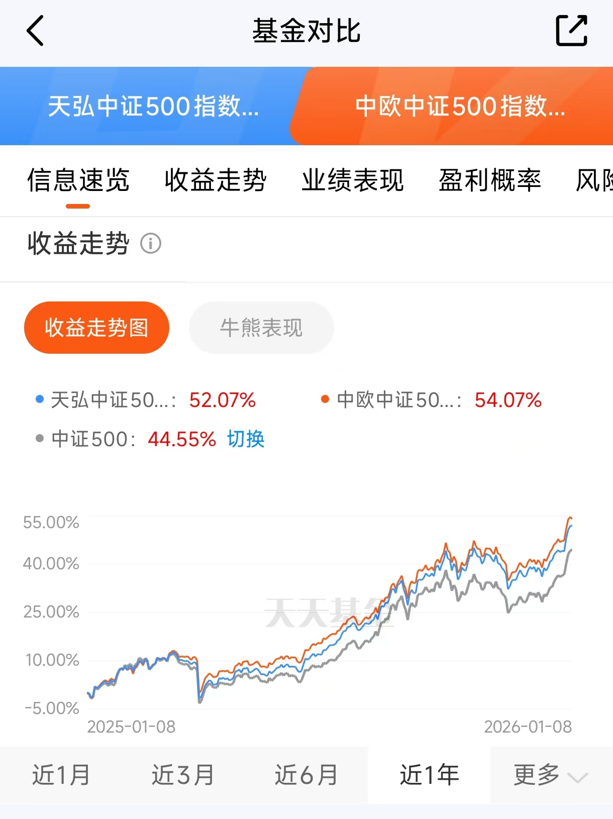 手里有点闲钱,又买了$中欧中证500指数增强C$(015454)。我选它的逻辑很直接:收益说话。近一年54.07%,今年来42.48%,这个表现在中证500增强产品里是拔尖的。不信你拉个列表比比,天弘中证500指数增强C(001557)近一年52%,要知道他们跟踪的是同一个指数,中欧这个领先幅度不小。它把近一年和年度的涨幅冠军都拿了,超额部分看得见摸得着。更关键的是性价比,它走公募的渠道,收公募的费用,但增强策略有点私募的范儿。比起那些高不可攀的私募门槛,这个一块钱就能买,申购费没有,管理费一年1%,成本低了一大块。成本低了,收益却没打折,近一年近54%的涨幅,这水平相当可以了。眼下这个阶段,中证500指数覆盖面广,既有周期性的行业,也有成长性的板块,整体估值不算高,布局的价值正在显现。机会摆在这儿,动作快的人才能捡到便宜。#2025超额关键词#