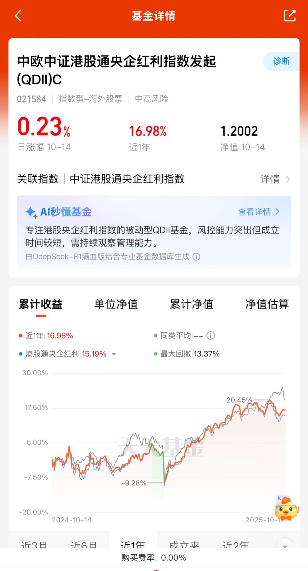 $中欧中证港股通央企红利指数发起(QDII)C$ :今日涨幅0.23%!