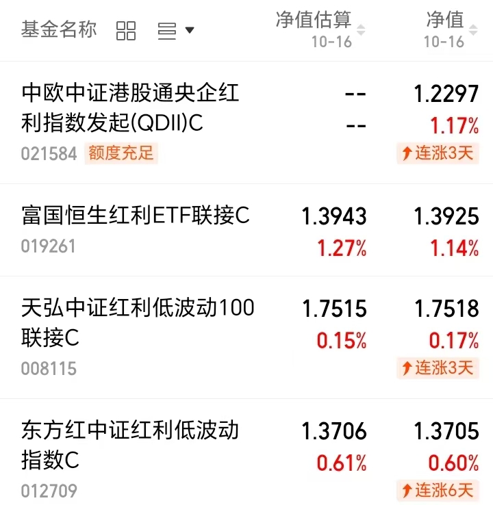 $中欧中证港股通央企红利指数发起(QDII)C(OTCFUND|021584)$今天上涨1.17%;