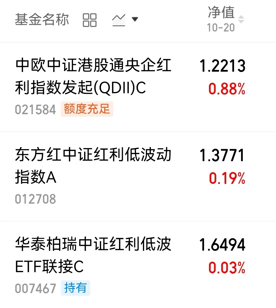 $中欧中证港股通央企红利指数发起(QDII)C$ 今天涨0.88%,红利类资产一般具备低估值,高股息的特点,特别是港股通央企红利估值就更低了,关键震荡也不怕,抗跌能力比较强。