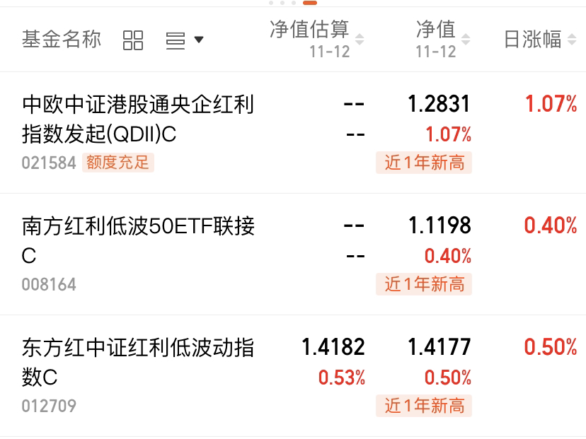 今天的市场开盘就注定着不乐观,下跌的虽然指数不多,但情绪面比较低,权重红利开始护盘,今天虽说不怕,但分化还是存在的,$中欧中证港股通央企红利指数发起(QDII)C(OTCFUND|021584)$今天上涨1.07%,主要是银行的带动。$南方红利低波50ETF联接C(OTCFUND|008164)$上涨0.4%,$东方红中证红利低波动指数C(OTCFUND|012709)$上涨0.5%。