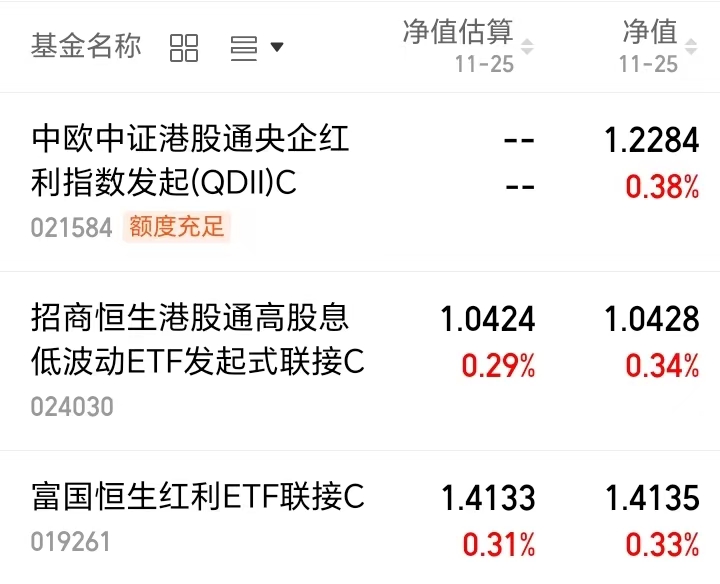 $中欧中证港股通央企红利指数发起(QDII)C(OTCFUND|021584)$上涨0.38%;