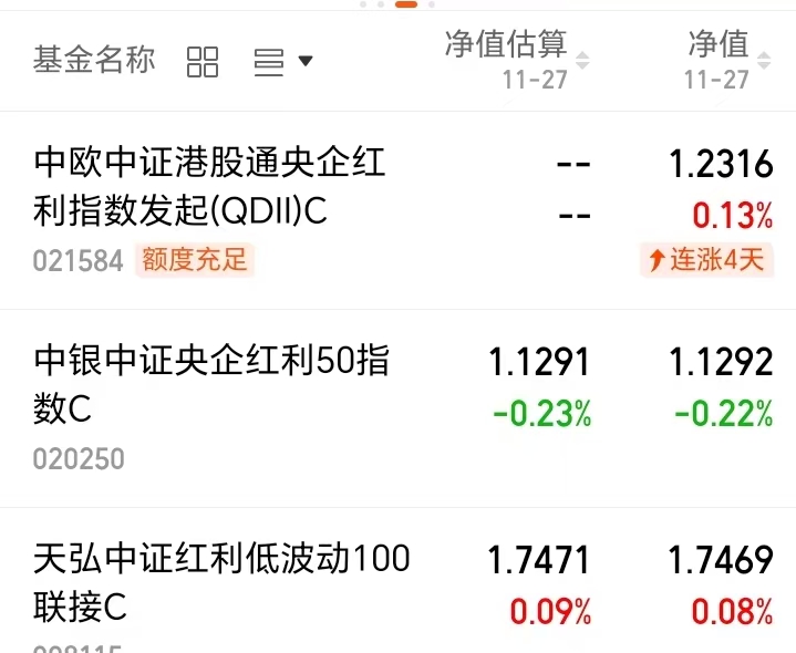 $中欧中证港股通央企红利指数发起(QDII)C(OTCFUND|021584)$今天上涨0.13%;