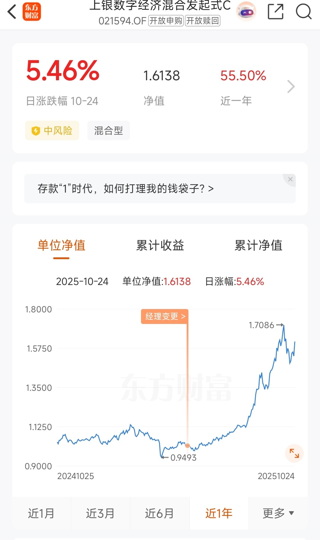 这波$上银数字经济混合发起式C$(021594)涨得又扎实又有后劲!上周跟着半导体芯片产业链涨超5%,今日小涨,产业端传来新利好:某光模块厂商10月新签海外订单超10亿,国产800G光模块良率突破95%,基金持仓占比不低;外资10月净流入电子板块超200亿,资金合力推着行情走,完全能吃全这波数字经济成长红利。#沪指再创十年新高!接下来你会如何操作?#