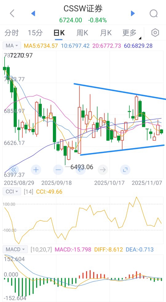 一根K线控制下的楔形整理。主力通过控制证券,引导大盘继续调整。证券突破楔形整理之时,新的行情有望开启。