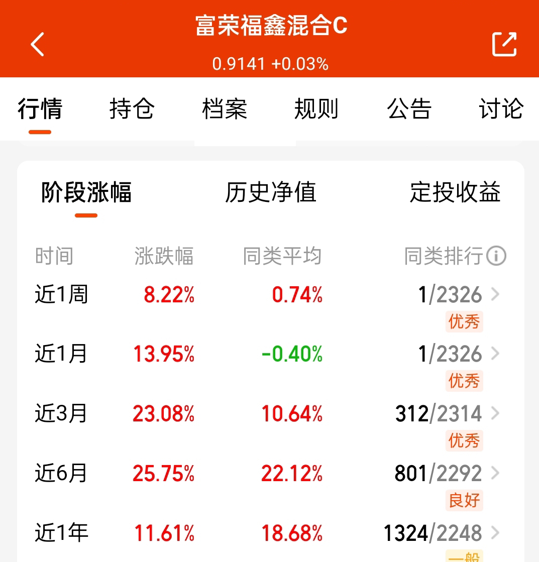 今年的电池涨得可真香了呢,拿了些$富荣福鑫混合C$ ,各阶段业绩都很优秀,业绩还第一