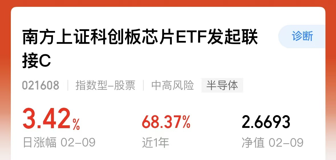 短期来看,昨日半导体板块头部个股集体大涨奠定情绪基础,$南方上证科创板芯片ETF发起联接C(OTCFUND|021608)$昨日(2月9日)单日上涨3.42%,近6个月涨幅达58.89%,反映出资金对半导体板块尤其是科创板芯片赛道的积极预期;叠加春季躁动行情临近,资金正提前布局业绩确定性高的半导体标的。