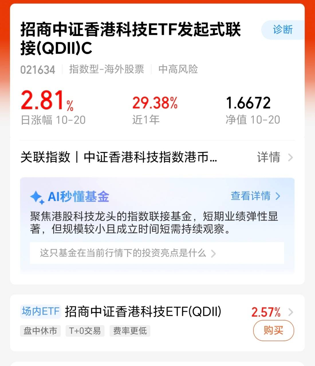 今天港股延续昨日涨势,高开高走继续冲啊。不得不说进入全球降息周期,港股价值洼地还是更受资金青睐!今年来南向资金更是创下1万亿新高,可见普遍看好港股上涨空间。而$招商中证香港科技ETF发起式联接(QDII)C(OTCFUND|021634)$,更是表现亮眼,昨日大涨近3个点,今天还在继续冲,眼看又是2个点的涨幅,车上的真的赢麻了。毕竟这只基金涵盖在港股上市的优质科技龙头,如阿里、腾讯等,财报亮眼,业绩有望带动行情继续展开,还真是期待其后市表现呢。$嘉实中证半导体指数增强发起式C(OTCFUND|014855)$$嘉实中证软件服务ETF联接C(OTCFUND|012620)$$中欧中证机器人指数发起C(OTCFUND|020256)$#指数操盘手集结令##10月基金投资策略##宁德时代Q3净利润185.5亿元!如何解读?#