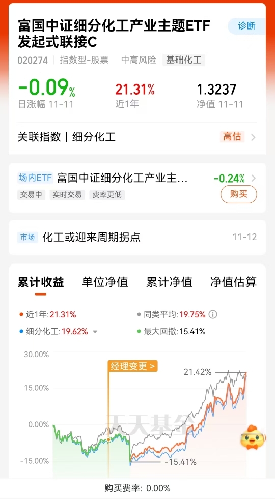除了投科技,这边也配了点富国中证细分化工产业主题ETF联接C,这基金近6个月涨了36%,跟踪误差才0.3%,跟指数几乎同步,化工板块回暖时它跑得挺快。