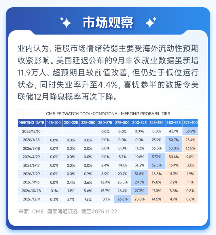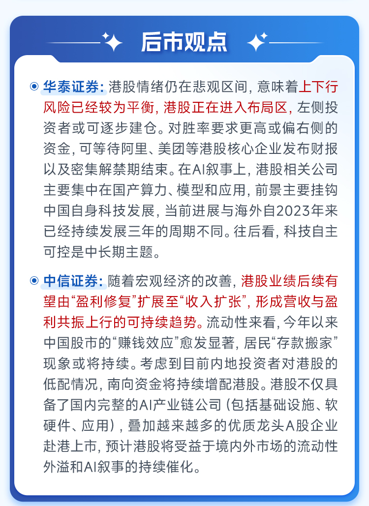 中信证券:随着宏观经济的改善,港股业绩后续有望由“盈利修复”扩展至“收入扩张”,形成营收与盈利共振上行的可持续趋势。流动性来看,今年以来中国股市的“赚钱效应”愈发显著,居民“存款搬家”现象或将持续。考虑到目前内地投资者对港股的低配情况,南向资金将持续增配港股。港股不仅具备了国内完整的AI产业链公司(包括基础设施、软硬件、应用),叠加越来越多的优质龙头A股企业赴港上市,预计港股将受益于境内外市场的流动性外溢和A/叙事的持续催化。