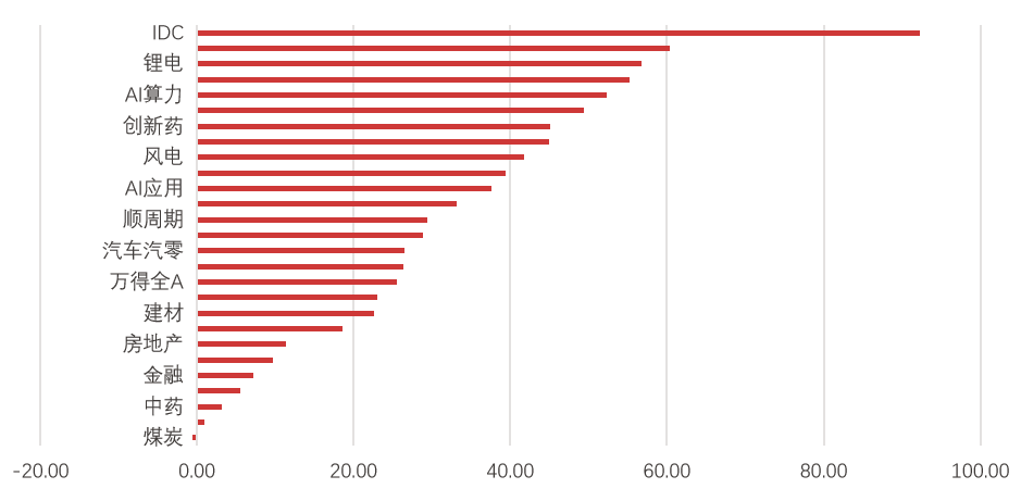 2025年以来,A股结构分化特征显著。从产业链涨跌幅看,IDC、锂电、AI算力等强产业周期板块年初至今涨幅均超50%,其中IDC涨幅达到92.24%;而中药、煤炭等板块表现低迷,煤炭板块甚至出现-0.59%的负增长(数据来源:wind)。