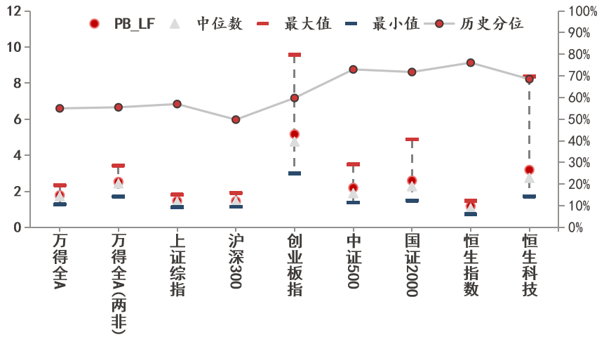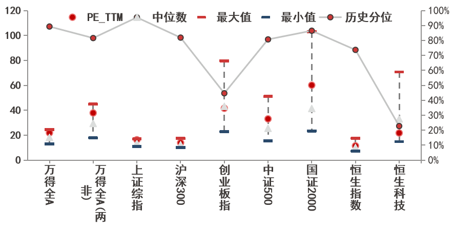 估值方面,A股主要指数PE_TTM 多数处于历史较高分位,上证综指分位数高达98.9%,万得全A也达到93.8%;但PB_LF 分位多在50%-70% 区间,显示估值修复更多由盈利预期驱动(数据来源:wind)。