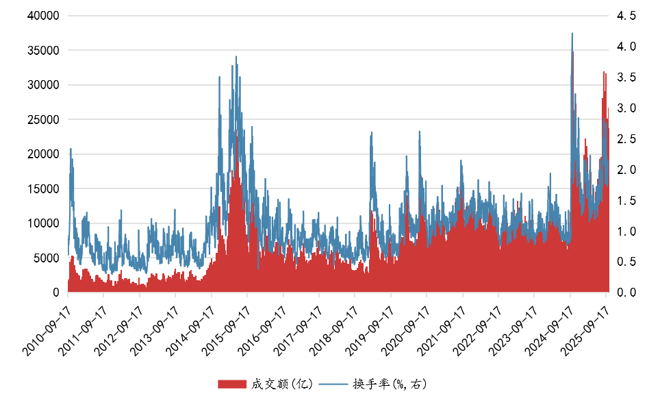 图:万得全A成交额与换手率(2010年至2025年10月)
