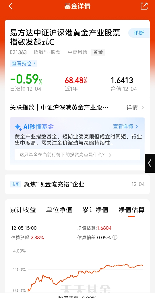 黄金今天大涨!黄金股在黄金的基础上加了杠杆和久期,所以比黄金ETF弹性高,还有很多黄金股公司还有有色金属业务,有色大涨也能跟上!易方达中证沪深港黄金产业股票指数发起式C近一年涨了68.48%,表现还不错,我准备分批布局!