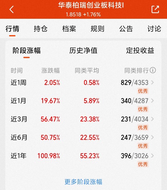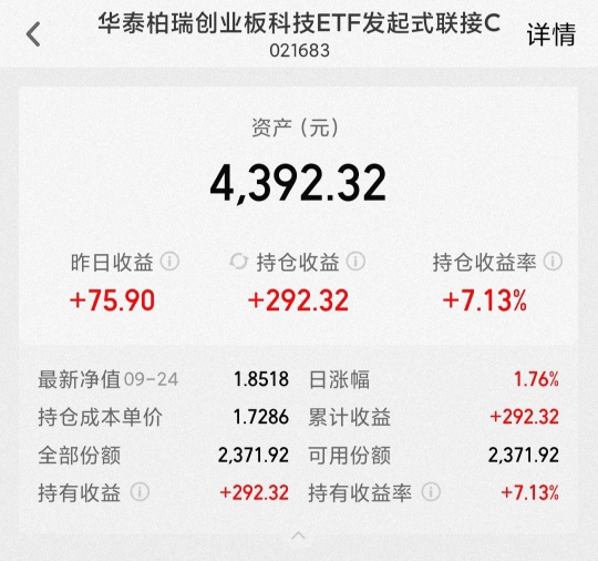 又涨了,$华泰柏瑞创业板科技ETF发起式联接C$ 目前估值涨幅超2%,净值预计5连涨,继续刷新新高,我近期布局后连续吃肉,目前持有4392元,持有收益率为7.13%,今天过后预计收益接近10%,我还是比较满意的。