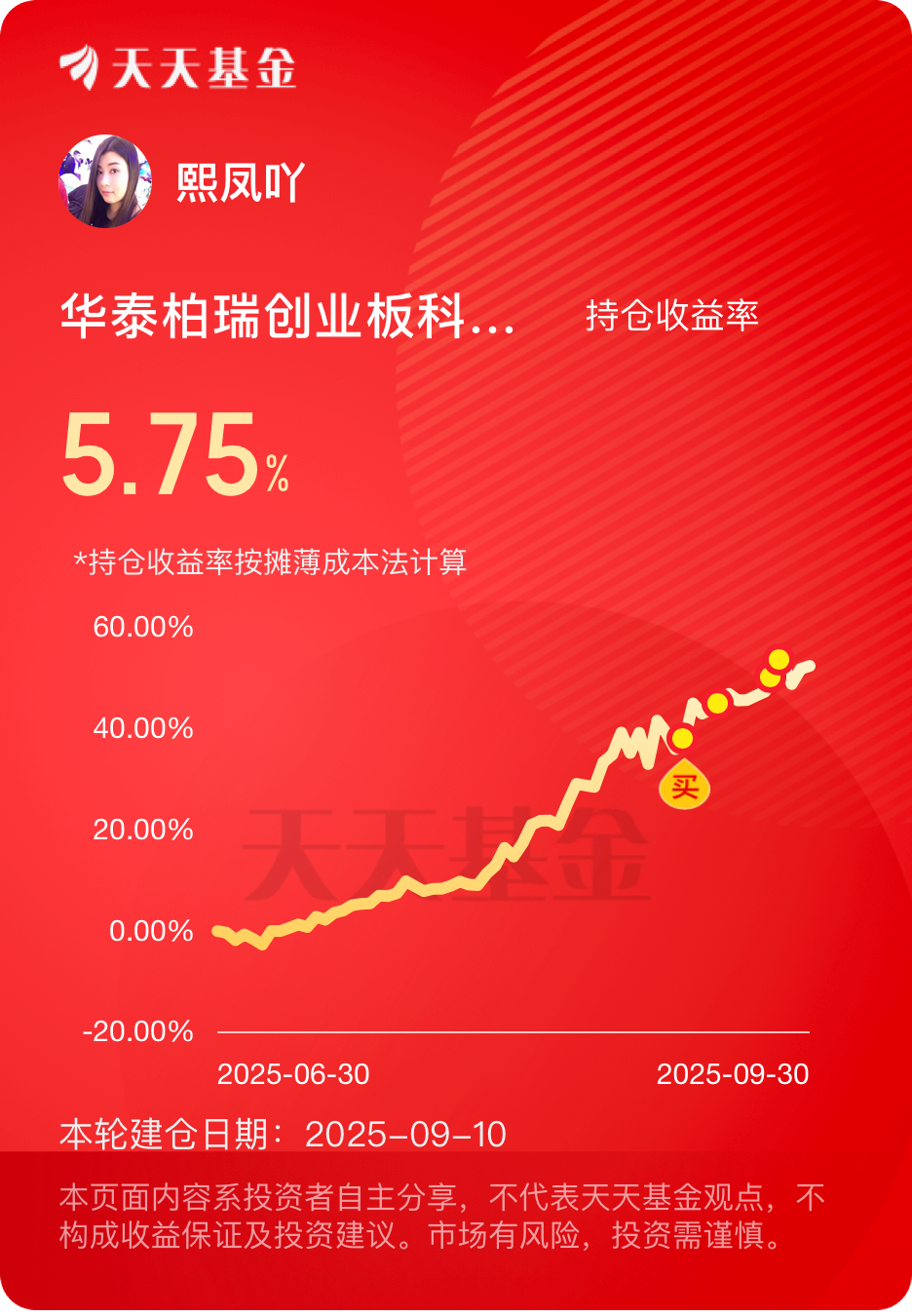 熙凤上个月开始在分批建仓$华泰柏瑞创业板科技ETF发起式联接C$ ,这个产品是被动跟踪创业板科技的,持仓覆盖了半导体、新能源等高成长赛道,是从创业板指数中挑选的市值最大,流动性最好的50家科技企业。它近一年收益率已经超过了56%,熙凤持仓不到一个月,持仓涨幅已经超6%!今天板块再度爆发,芯片电池、cpo全部大涨!现在看估值已经涨超1.5%。这里面688的半导体设备及材料、存储芯片、甚至封测,趋势都在向上。现在存储芯片涨价延续,AI推动NAND闪存需求大幅增加,另外假期里OpenAI与AMD再度宣布百亿美元芯片大单刺激芯片股。马上10三季报也要出来了,也将给高景气的芯片带来催化。创业板因为每天有20%的涨跌幅,它的锐度相对主板也将更高。#晒收益# #沪指盘中突破3900点!什么信号?# #10月你看好哪些投资赛道?# #国际金价史上首次升破4000美元大关#