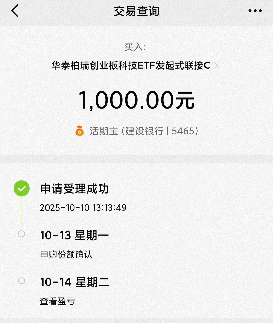 加仓1000元$华泰柏瑞创业板科技ETF发起式联接C(OTCFUND|021683)$,该基金跟踪创业板科技指数,主要持仓的是创业板中科技创新属性和成长性比较高的个股,近几个月其成分股持续上涨,也使得该基金收益连续上涨,连续刷新收益新高,数据显示截止到昨天为止,该基金年涨幅达55%,多阶段表现优秀,我在近期才入手,短短数天,也赚了近10%,我还是比较满意的。