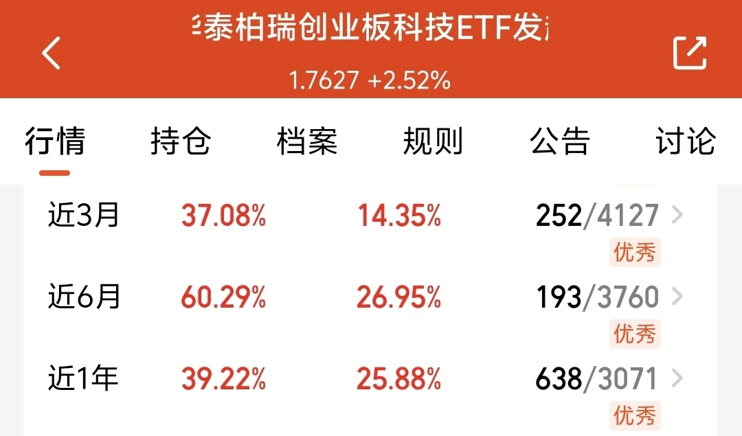 今天$华泰柏瑞创业板科技ETF发起式联接C$ 又涨超3%,近3个月收益37.08%表现稳健。科技行情还在延续,值得期待。