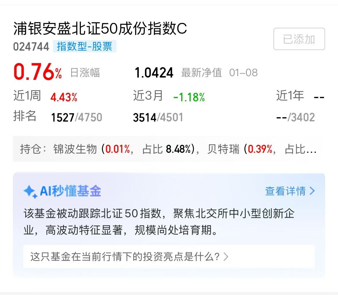 浦银安盛北证50跟踪紧密,后面额度只会越来越紧张,不限购的北证50操作起来$浦银安盛北证50成份指数C$