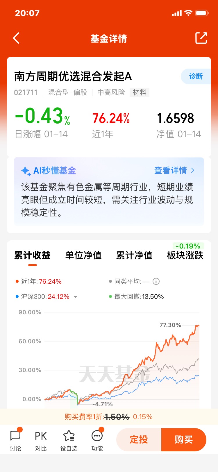 第四,从产品设计看,它是一只 “混合型”基金,股票资产占基金资产的60%-95%。这个仓位范围给了基金经理较大的灵活性:在周期底部确认、机会明确时,可以保持较高仓位进攻;在市场整体风险较大或需要等待更明确信号时,也可以适当降低仓位,控制回撤。这种灵活性对于波动较大的周期投资而言,是一种宝贵的风险调节工具。