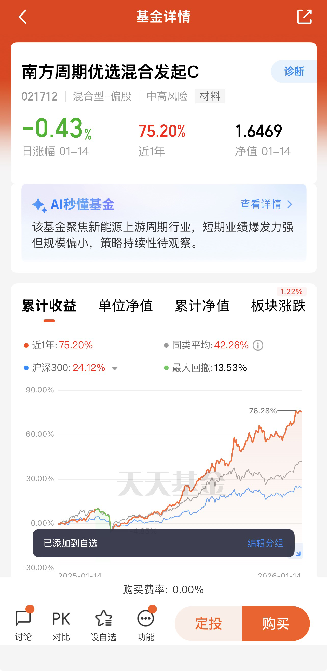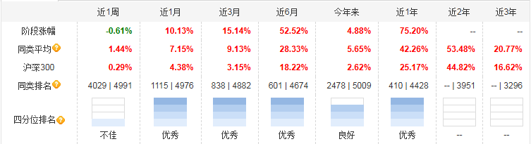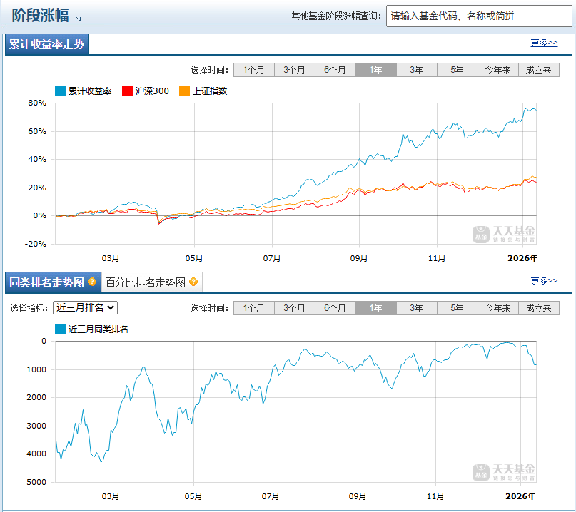 基金成立以来(2024 年9 月19 日)业绩表现亮眼,截至2026 年1 月14 日,近1 个月涨幅10.13%、近3 个月15.14%、近6 个月52.52%、近1 年75.20%,各阶段涨幅均大幅跑赢同类平均(近1 年同类平均35.39%)和沪深300 指数(近1 年27.90%),同类排名稳居前10%(近1 年682/8045),四分位排名多次获评 “优秀”。2025 年度涨幅67.79%,远超同类平均27.62%,展现出强周期行情把握能力。