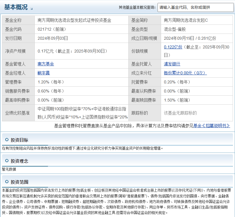 南方周期优选混合发起C(021712)的核心优势在于精准的周期投资策略、基金经理的专业投研能力、亮眼的业绩表现及友好的费率结构,同时发起式基金属性进一步保障了管理人的履职积极性。对于认可周期投资逻辑、具备一定风险承受能力且有中长期持有计划的投资者,该基金具备较高的配置价值。