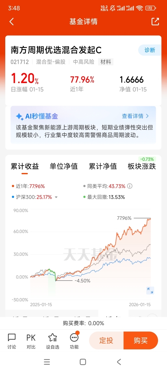 南方周期优选混合发起C的精准策略、灵活运作与强大投研,共同构成了投资收益的“三重保障”。对于普通投资者而言,个人很难全面跟踪周期行业的复杂变化,而通过配置这款基金,不仅能够实现对周期行业的分散化投资,降低单一标的风险,更能依托基金管理人的专业能力,把握行业轮动节奏,提升投资效率。此外,基金C类份额的低费率优势,进一步降低了长期投资的成本,放大了复利效应,为实现资产的稳健增值提供了有力支撑。