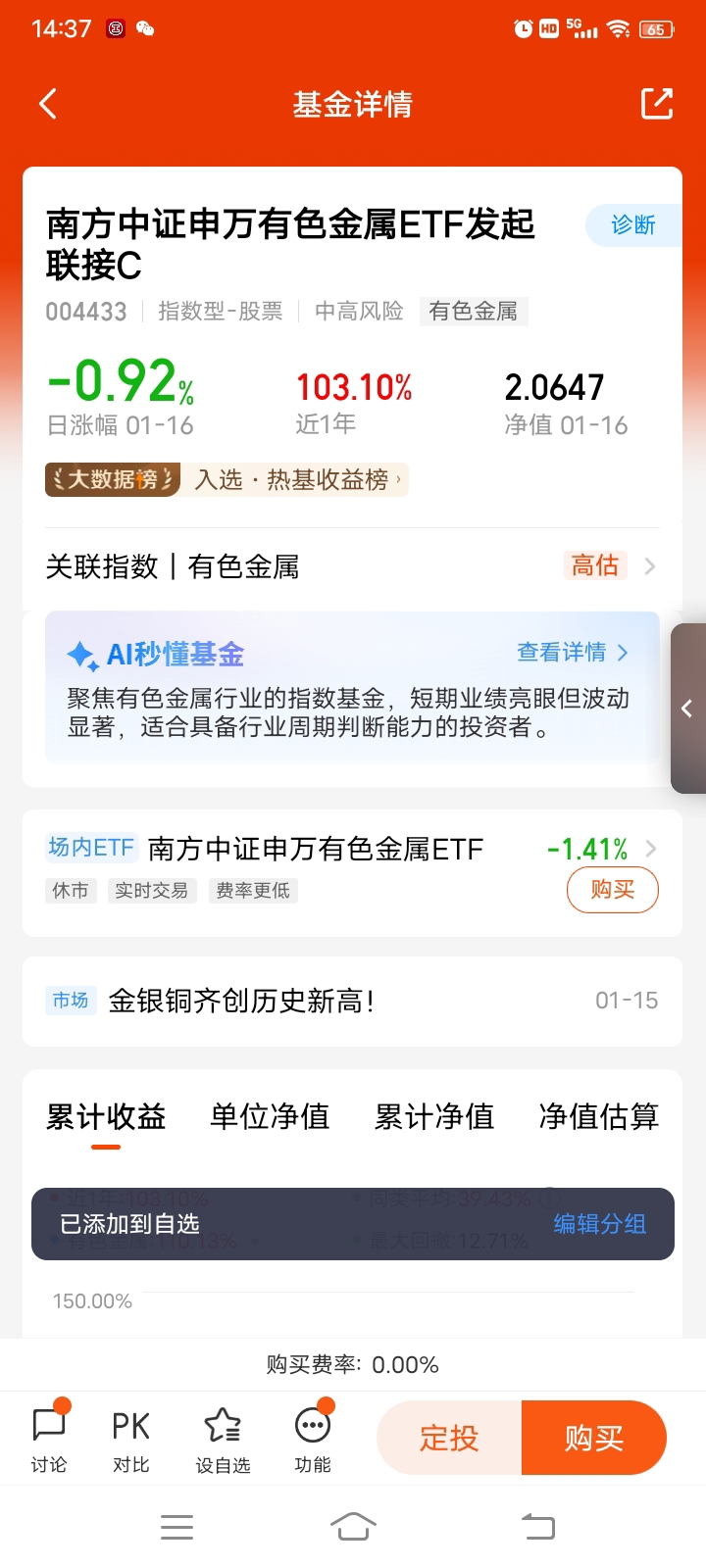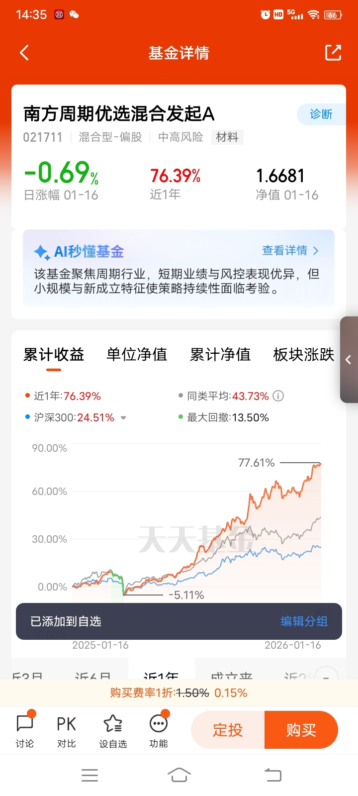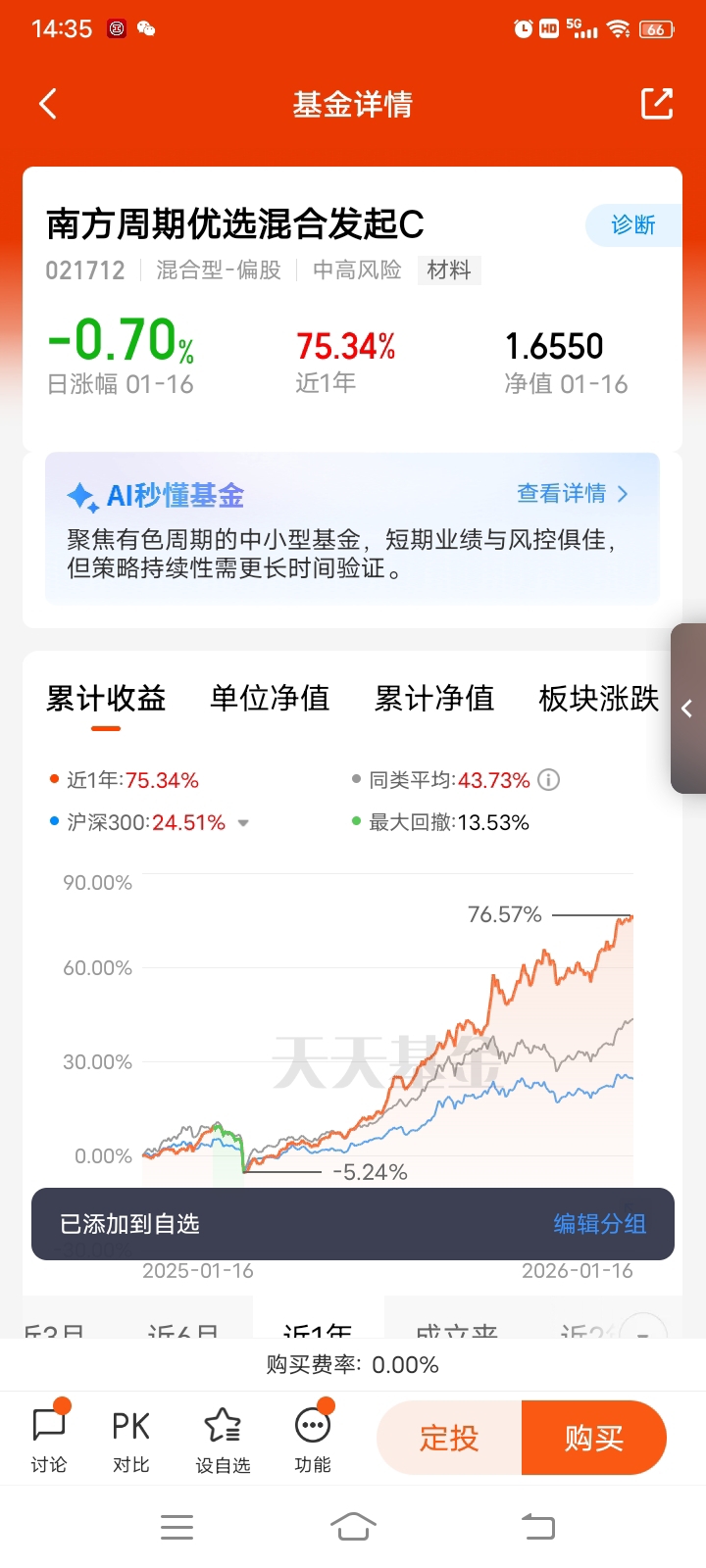 南方周期优选混合发起C这只基金,我觉得很适合现在布局定投。它聚焦有色、化工这些周期板块,刚好踩中了2026年的几个重要风口。从国际上看,美联储进入降息周期是大概率事件,美元走弱会直接利好黄金、铜等大宗商品价格,而国内经济复苏的势头也在持续,基建和制造业的回暖会带动上游原材料的需求。基金近1年75.34%的收益率,大幅跑赢同类平均和沪深300,说明基金经理在把握周期节奏上有一套,而且最大回撤13.53%,在中高风险的周期基金里算控制得不错的。