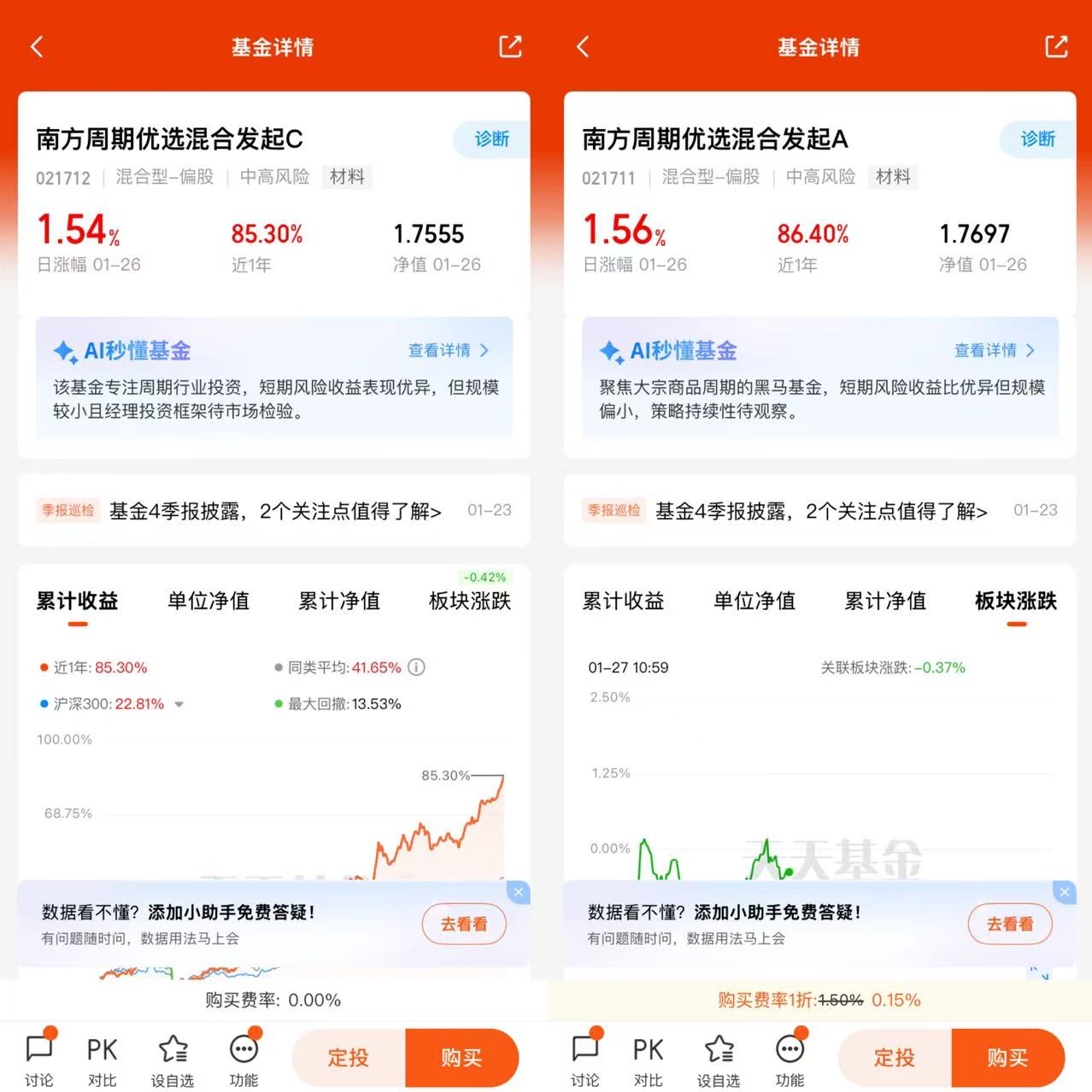 南方周期优选混合发起C作为中风险周期主题基金,其业绩表现已印证对周期板块的把握能力。截至2026年1月26日,该基金最新净值1.7555,当日涨幅1.54%,短期来看近1个月涨幅达10.69%,中期近3个月、6个月涨幅分别为20.91%、50.40%,长期近12个月涨幅更是高达84.52%,在周期板块上行周期中展现出较强的收益弹性。对于普通投资者而言,该基金的核心优势的在于通过专业管理分散风险,避免个股选择失误导致的损失——基金可依托团队对周期规律的理解,在有色金属、化工等景气赛道中精选优质标的,同时根据周期阶段调整仓位与行业配置,契合周期投资“顺势而为”的核心逻辑。