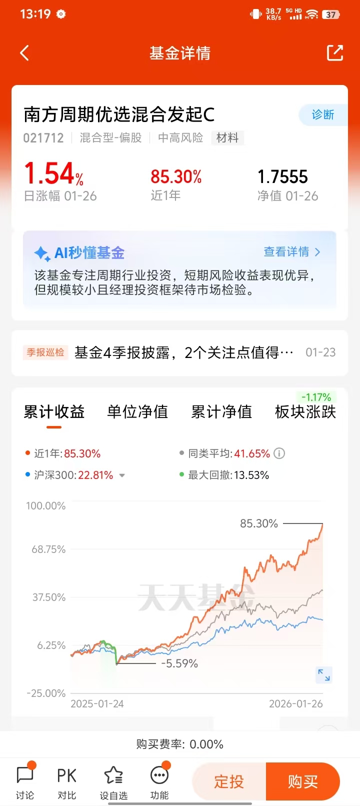 在公募基金市场中,周期主题基金同样表现出众。南方周期优选混合发起 C 便是其中的佼佼者,该基金凭借对经济复苏趋势的精准预判和前瞻性布局,取得了令人瞩目的收益成绩。截至1月26日,其年内涨幅超过11%,成立以来收益更是高达75.55%。大幅超越同类基金平均水平,充分彰显了当前周期行情的火热程度,也直观地反映出把握周期投资机遇所带来的丰厚回报。