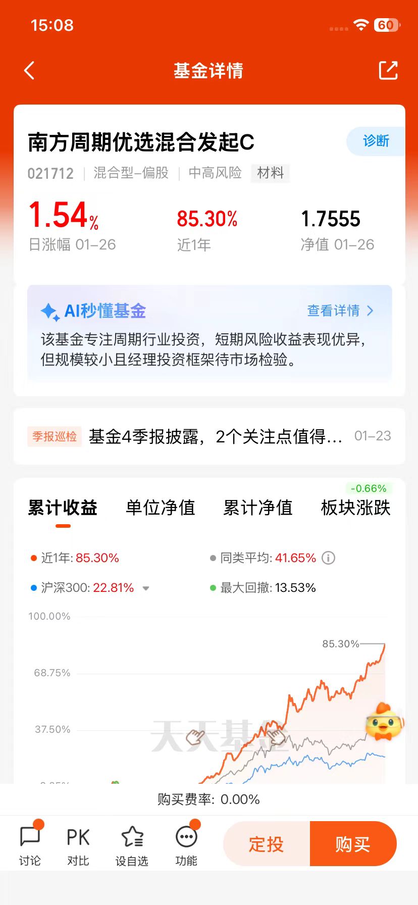 历史业绩亮眼:截至2026年1月14日,近1个月涨幅10.13%、近3个月15.14%、近6个月52.52%、近1年75.20%,各阶段涨幅均大幅跑赢同类平均(近1年同类平均35.39%)和沪深300指数(近1年27.90%)。