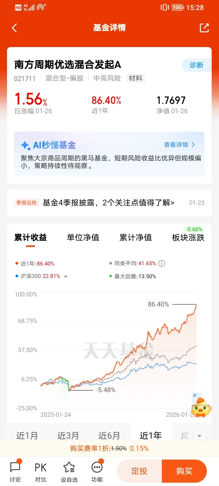 该基金近一月净值维持窄幅波动,每日净值走势稳定,体现出基金在周期板块行情中较好的仓位控制与选股能力。作为专注周期领域的基金,它能通过分散投资降低单一周期个股的波动风险,适合希望布局周期板块但缺乏个股研究精力的投资者。