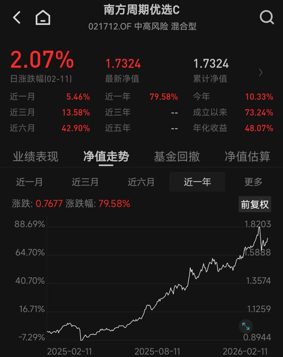 A股市场迎来春节前的最后几个交易日后,高位震荡态势依旧,资金呈现“节前避险、聚焦核心”的操作逻辑。截至午盘,沪指微涨0.12%,延续四连阳走势,两市成交额有所萎缩,但金属、算力、化工等板块依旧保持强势,中证有色金属指数上涨超1.30%,钨价持续走高,仲钨酸铵吨价挺进百万大关,化工板块中高端化学品个股表现活跃,成为资金布局的核心方向。在这样的行情下,南方周期优选混合发起C(021712)昨日大涨2.07%,再度展现了其强劲的盈利能力。