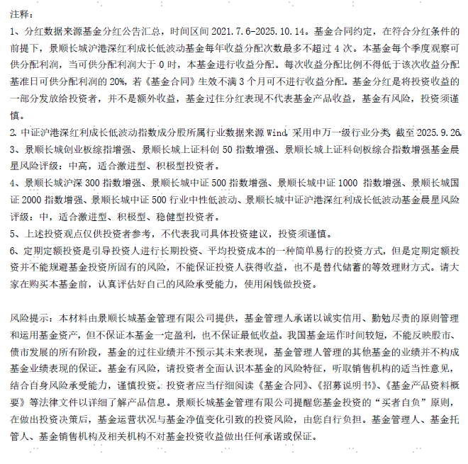 具体到红利投资标的选择上,$景顺长城沪港深红利成长低波指数E(OTCFUND|021735)$、$景顺长城沪港深红利成长低波指数A(OTCFUND|007751)$、$景顺长城沪港深红利成长低波指数C(OTCFUND|007760)$,已经连续18个季度分红【注1】,跟踪指数覆盖A股+港股两地优质红利股,成分股前三大行业分布为银行(26.07%)、医药(8.01%)、机械设备(6.22%)【注2】,分散投资市场,还将成长纳入选股指标,兼顾成长进攻特性。风险适配前提下,欢迎关注。