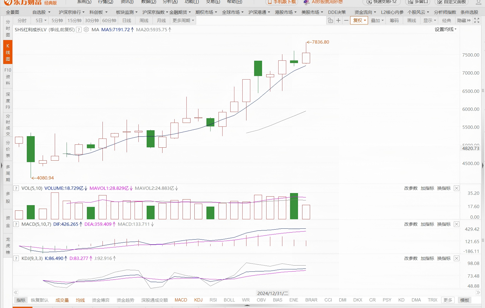 把K线周期放大到季线,发现SHS红利成长LV以5均线为支撑一路向右上,阴阳线的比例甚大。