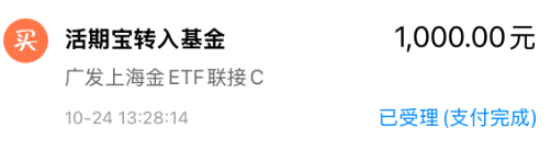 我加仓$广发上海金ETF联接C(OTCFUND|008987)$1000元!黄金在10月17日突破千元并创下历史新高后迎来调整,本周整体调整了5个多点,其实我觉得这个位置有个调整正常,毕竟1000元是个大的整数关口,如果一口气突破了,后面风险会更大,震荡一段时间再突破会比较稳,上1000是迟早的事,所有我有闲钱就存上一笔,耐心拿长期。