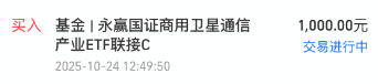 我加仓$永赢国证商用卫星通信产业ETF发起联接C(OTCFUND|024195)$1000元,跟踪的卫星通信指数这会看大涨3.3%左右,今天如果稳住就要走出突破行情啦,趁还没收复前面调整失地,我上车一笔,目前场内外跟踪此指数的基金只有永赢,指数基金费率便宜,操作起来也更灵活。