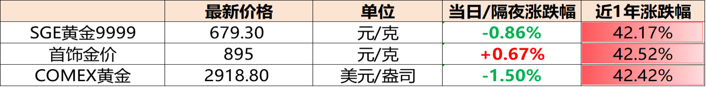 注:数据来源于wind,当日数据截至2025.2.26,近1年涨跌幅统计区间为2024.2.26-2025.2.26,其中首饰金价取自周六福足金999当日价格,数据来源于周六福官网,仅供参考;COMEX黄金数据为隔夜涨跌幅,数据截至2025.2.25,近1年涨跌幅统计区间为2024.2.25-2025.2.25,过往数据不代表未来表现,市场有风险,投资须谨慎。