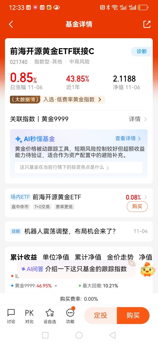 今年以来黄金走势强劲,$前海开源黄金ETF联接C$ 这款基金正好为投资者提供了一种便捷、安全、透明的黄金投资方式,而且费率非常低,可以节省投资成本。无论是追求资产保值增值的稳健投资者,还是希望在黄金市场中获取超额收益的激进投资者,$前海开源黄金ETF联接C$ 都值得一试。让我们一起抓住黄金投资的机遇,开启财富增值的新篇章吧!