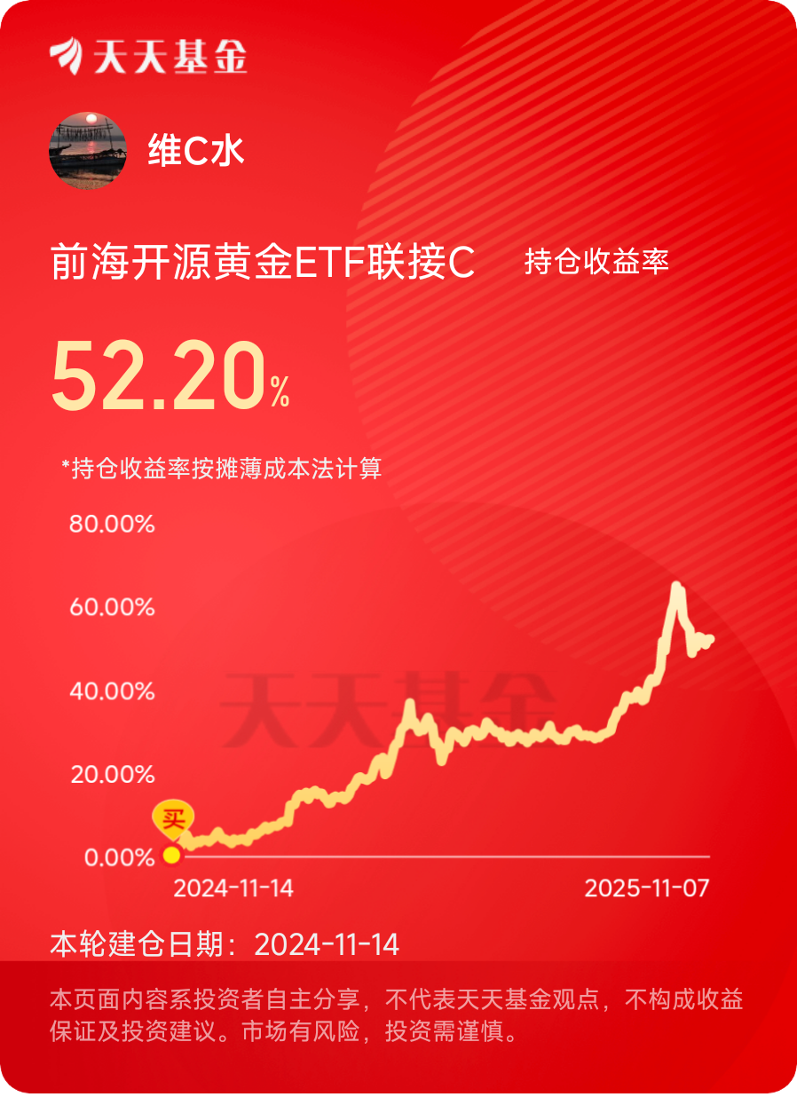 现在回头看,那些“不管不问”的日子,反而成了赚钱的关键。这一年里,全球局势起起落落,经济波动、地缘冲突不断,黄金的避险属性慢慢凸显,价格一路往上走,从260多涨到现在的400多,我的浮盈也一点点从负数变成了52%。有朋友说我“运气好”,赶上了黄金牛市,但只有我知道,这份收益里,运气只占一点点,更多的是“不折腾”的定力。@前海开源基金