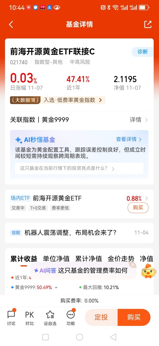 最近金价屡创历史新高,投资者收获颇丰。本人就很喜欢投资黄金,今年以来也获得了不错的收益。预计金价还会继续走强,现在金价大幅震荡,正好可以通过$前海开源黄金ETF联接C$ 择机逢低吸纳。