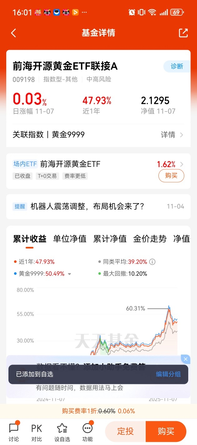 我选择$前海开源黄金ETF联接C$ 去年全球市场震荡加剧,我持有的股票基金单月回撤超15%,辛苦积累的收益瞬间缩水,让我深刻意识到资产组合中“避险工具”的不可或缺。当前全球地缘政治冲突频发、通胀预期反复,美元指数波动加剧,黄金作为硬通货的抗通胀、对冲风险属性愈发凸显——它与股票、债券相关性低,能在市场动荡时逆势保值,这也是我看好黄金投资的核心原因。一次理财分享会上,我偶然了解到前海开源黄金ETF联接基金,被其“低门槛参与黄金投资”的特性吸引,抱着试错心态开启了小额定投。没想到它竟成了我的意外之喜——该基金无需直接持有实物黄金,申赎灵活且1元起投,普通投资者也能轻松参与。在后续股市波动、美元指数震荡的行情中,它凭借黄金天然的抗风险属性,不仅没有亏损,反而实现了8%的年化收益,成功对冲了股票组合的部分损失。如今,这只基金已占我理财仓位的25%,无论市场如何风云变幻,都能凭借黄金的硬通货属性稳住收益基本盘,成为我稳健理财路上的“定心丸”。@前海开源基金