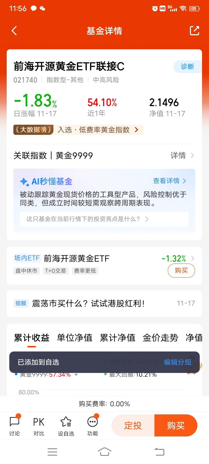说起来也算和这只基金“有点缘分”:之前买过前海开源的港股红利产品,体验不错,这次看黄金配置的时候,自然就注意到了它家的黄金ETF联接C。从费率到跟踪精度,再到资金灵活性,几个核心维度都刚好匹配我的需求,与其在同类产品里反复对比,不如直接选熟悉的“前海开源全家桶”成员。