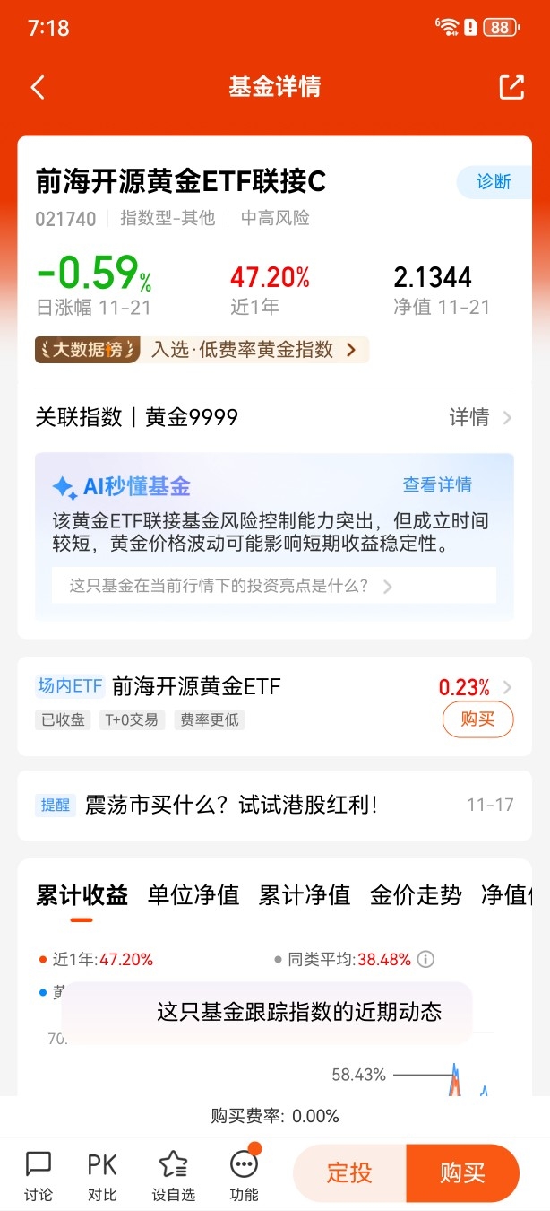 $前海开源黄金ETF联接C$的产品特性恰好适配波动市需求。作为跟踪黄金ETF的场外基金,其风险收益特征与国内黄金现货品种高度一致,能精准反映金价变化,且无需担心实物存储问题。更重要的是,其费率设计对中小投资者友好,短期持有成本可控,契合波动市中灵活调整的需求。