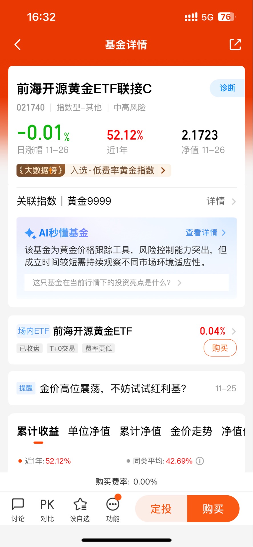产品设计对普通投资者格外友好,持有体验拉满。作为C类份额,它零申购费的设置大幅降低了入场门槛,持有满7天即可免赎回费,无论是小额定投分散成本,还是根据市场行情灵活调整避险仓位,都无需承担额外的费用压力。而且基金的管理费+托管费处于同类产品较低水平,长期持有能有效减少费用对收益的侵蚀。更重要的是,它的申赎流程与普通基金一致,无需开通特殊交易账户,通过日常基金平台就能操作,让普通投资者也能轻松参与黄金投资,不用再被实物黄金的存储、变现难题或黄金期货的高门槛所困扰。