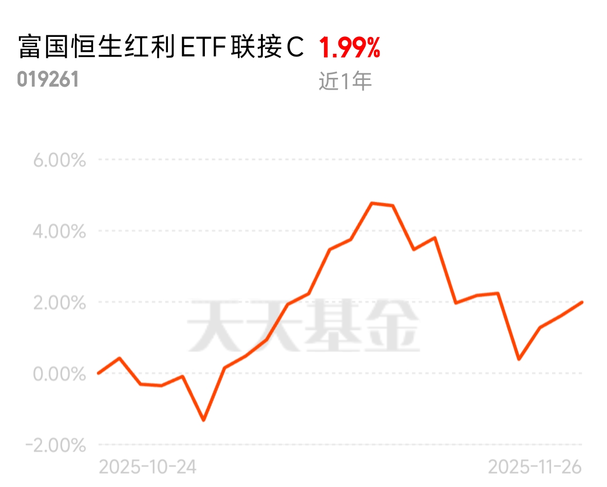 黄金ETF这段时间横盘,顺手配了点富国恒生红利C,近1个月涨2%、1年31%、2