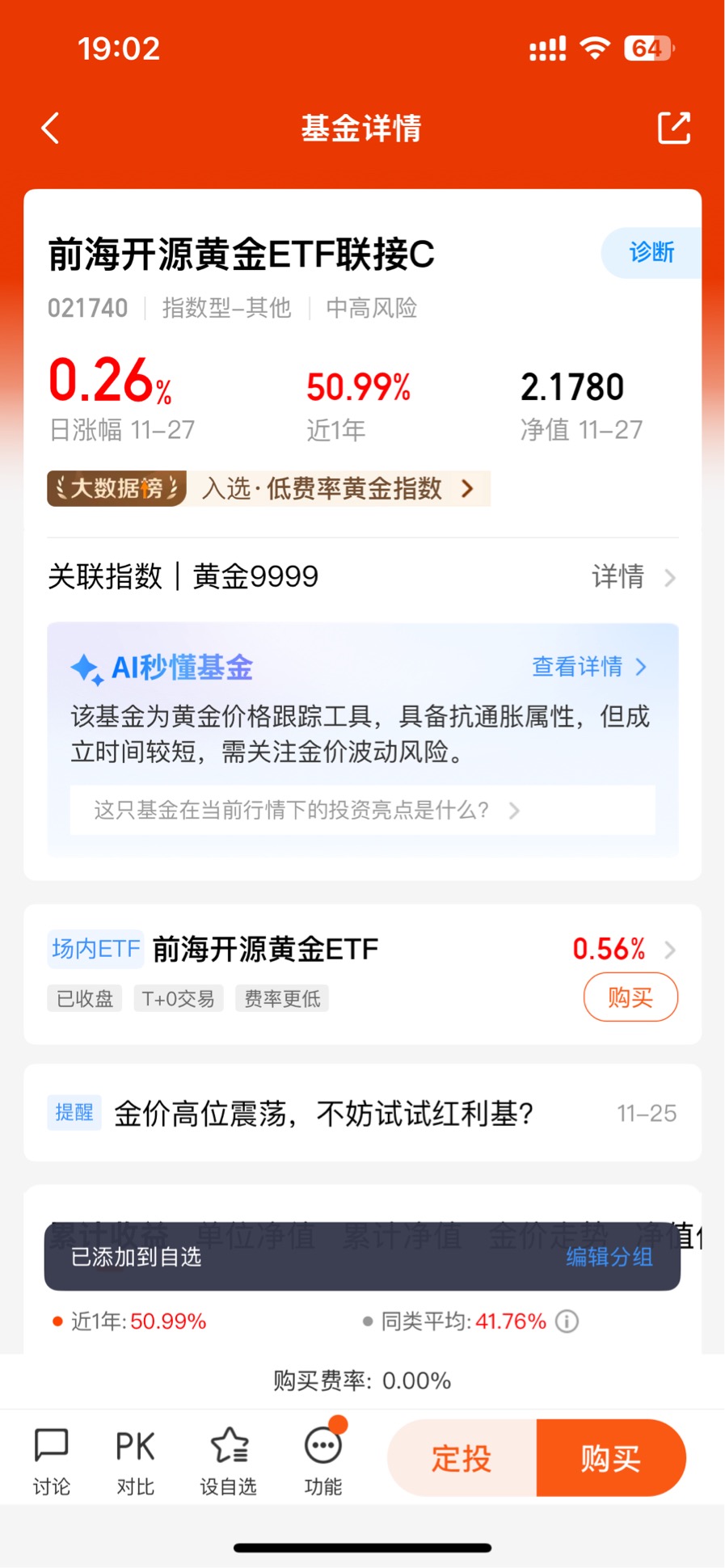 基金的“低门槛+优费率”设计,让普通投资者也能轻松参与。作为C类份额,它免申购费,仅计提销售服务费,大大降低了投资成本,尤其适合我这种长期持有、偶尔调整仓位的投资者,避免了申赎费用对收益的侵蚀。更重要的是,基金10元起投的低门槛,打破了实物黄金投资的资金壁垒,让我可以根据自身资金情况灵活布局,即使是小资金也能享受黄金资产的配置价值,真正实现“全民可投”。