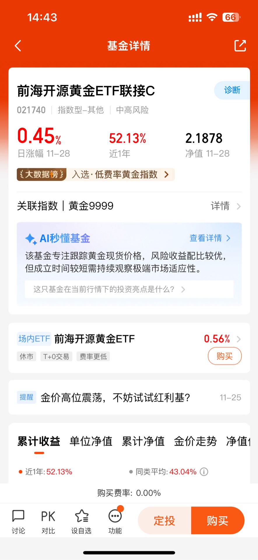基金的产品设计也特别适配普通投资者。作为C类份额,它没有申购费,持有满7天就能免赎回费,管理费和托管费也处于同类基金的中下水平。我平时会在市场波动较大时小额定投加仓,或是在权益资产收益丰厚时赎回部分份额进行再平衡,灵活的申赎规则和低廉的费用让操作毫无压力。而且它的持仓高度透明,主要投资于黄金ETF,底层资产就是黄金现货,不像一些混合基金那样暗藏风格漂移风险,持仓逻辑简单易懂,对新手也很友好。