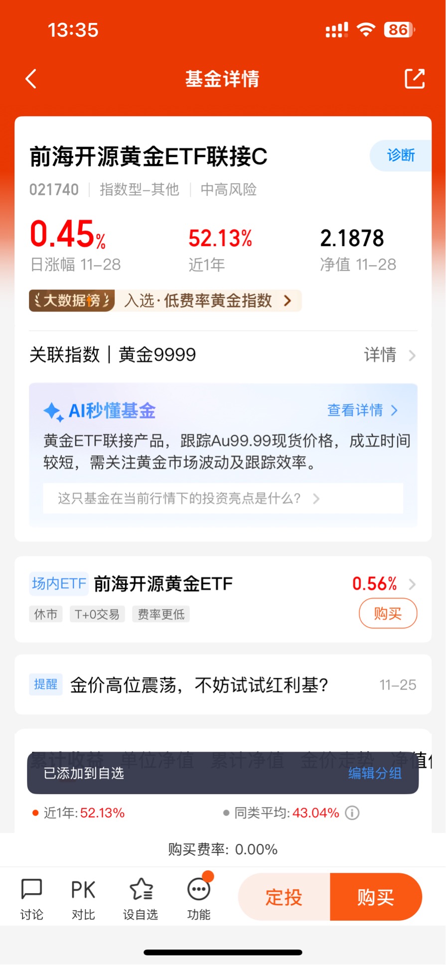 更让我放心的是其稳健的运作逻辑。基金不参与复杂的衍生品交易,始终聚焦黄金ETF投资,持仓清晰透明,净值波动完全贴合金价走势,不存在主动选股带来的额外风险。对于我这种追求确定性的投资者来说,这种“被动跟踪”的模式反而更具安全感,不用操心基金经理的操作风格漂移,只需把握黄金市场的大趋势就能稳健获益。